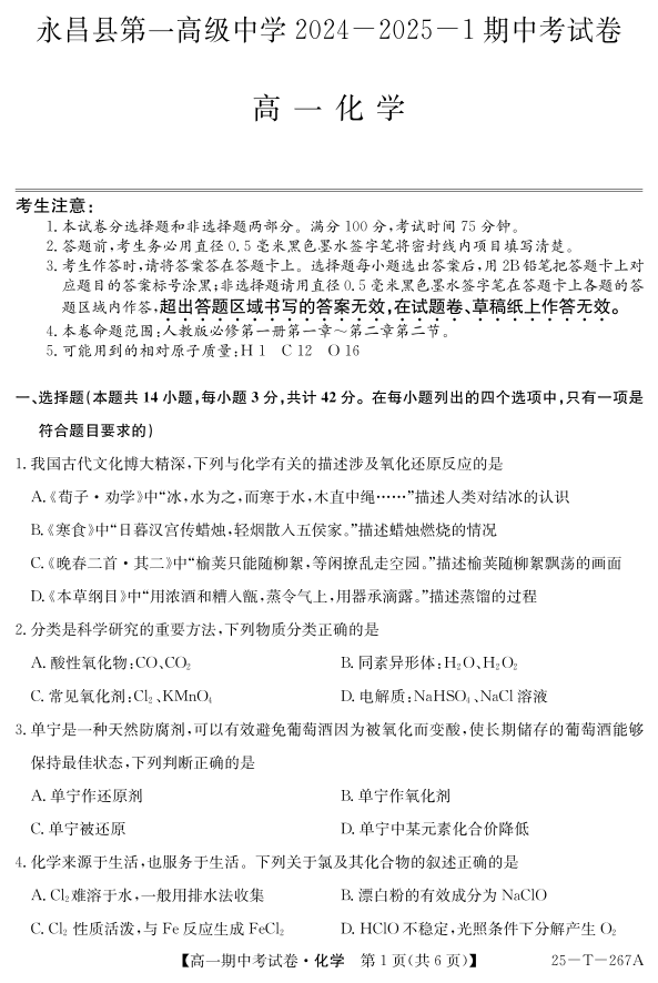 甘肃省永昌县第一高级中学2024-2025学年高一上学期期中考试 化学