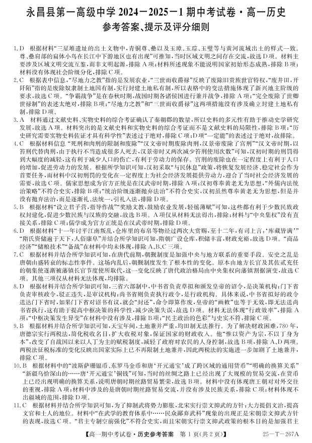 甘肃省永昌县第一高级中学2024-2025学年高一上学期期中考试 历史答案