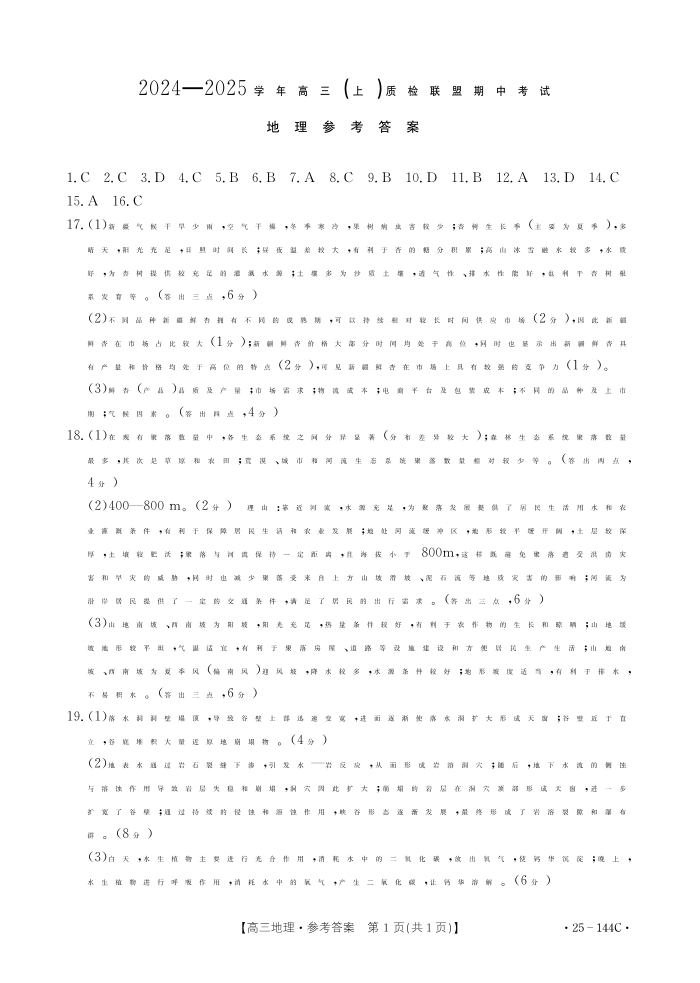 河北省邢台市质检联盟2024-2025学年高三上学期期中考试 地理参考答案