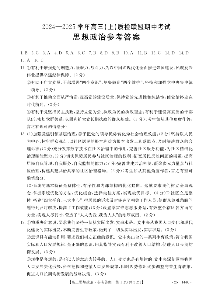 河北省邢台市质检联盟2024-2025学年高三上学期期中考试 政治参考答案