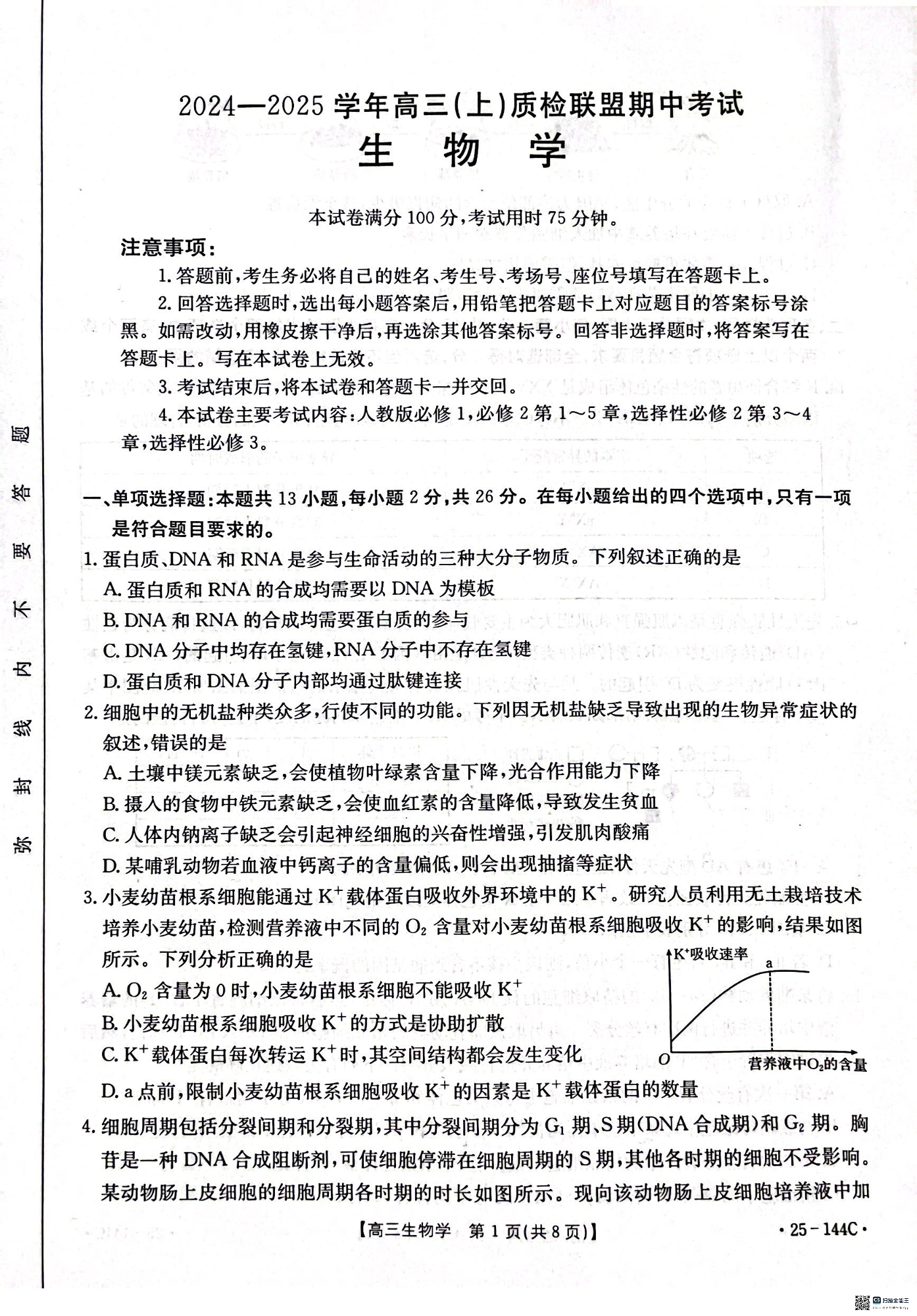 河北省邢台市质检联盟2024-2025学年高三上学期期中考试 生物