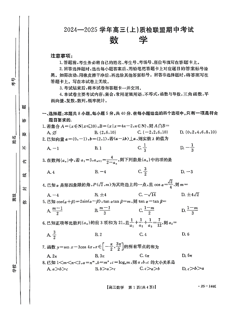 河北省邢台市质检联盟2024-2025学年高三上学期期中考试 数学