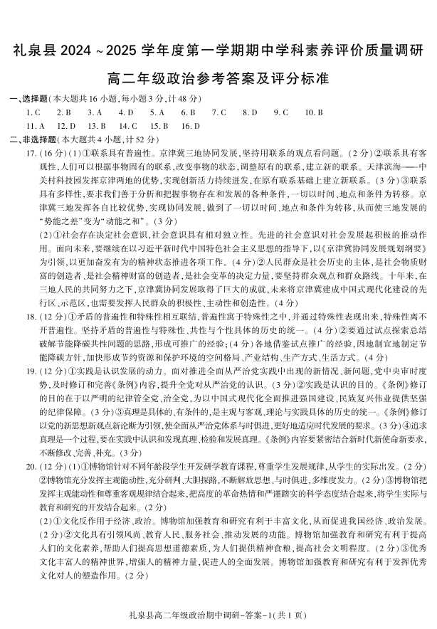 陕西省咸阳市礼泉县2024-2025学年高二上学期期中考试 政治答案