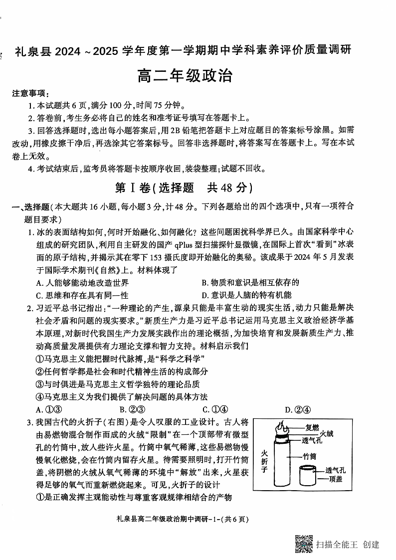 陕西省咸阳市礼泉县2024-2025学年高二上学期期中考试 政治