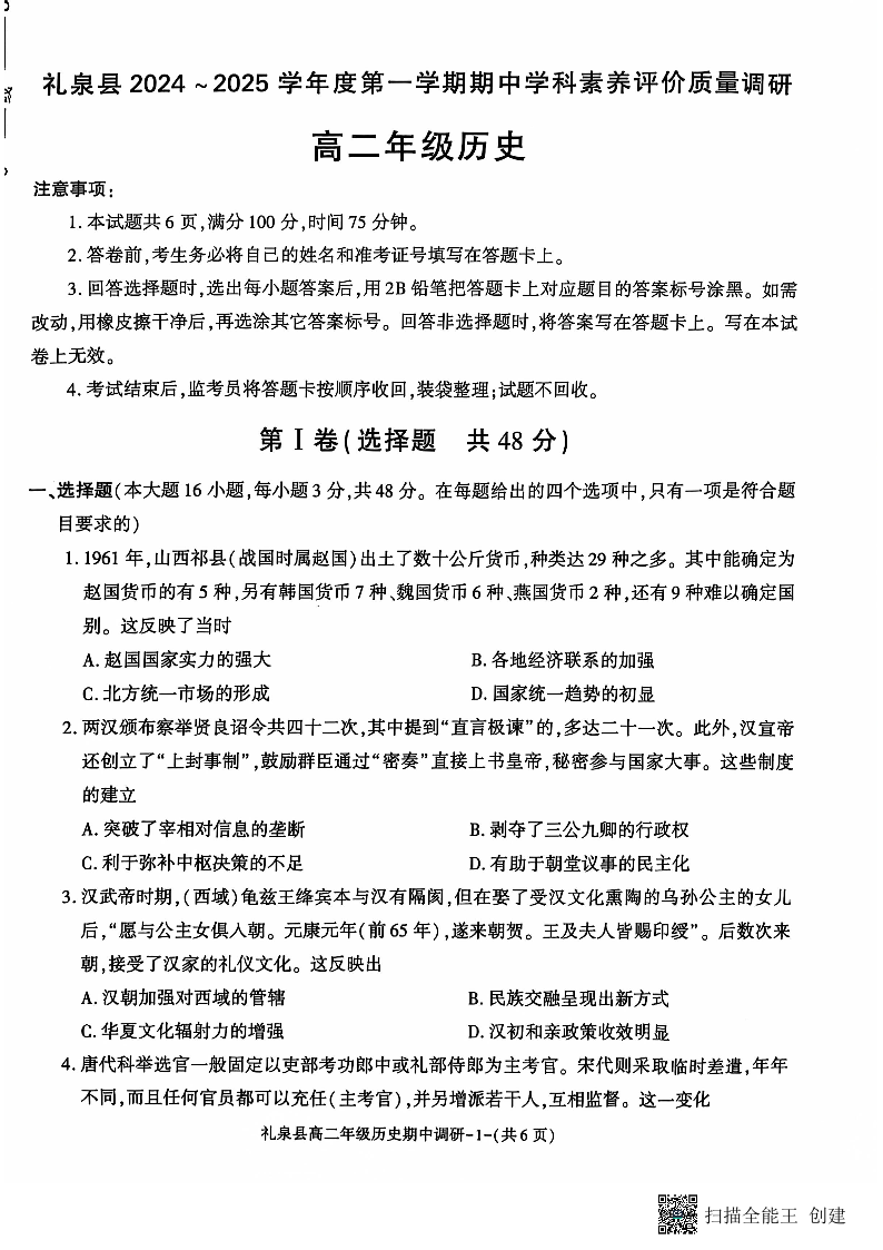 陕西省咸阳市礼泉县2024-2025学年高二上学期期中考试 历史