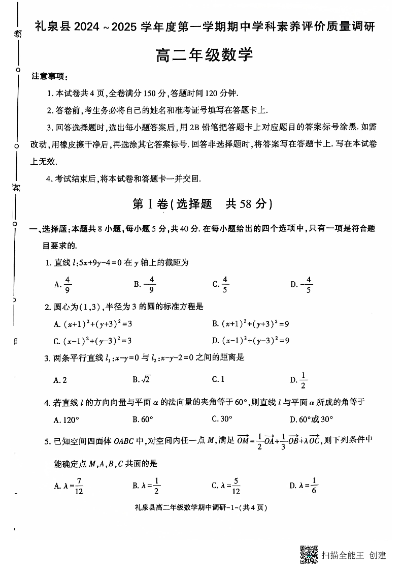 陕西省咸阳市礼泉县2024-2025学年高二上学期期中考试 数学