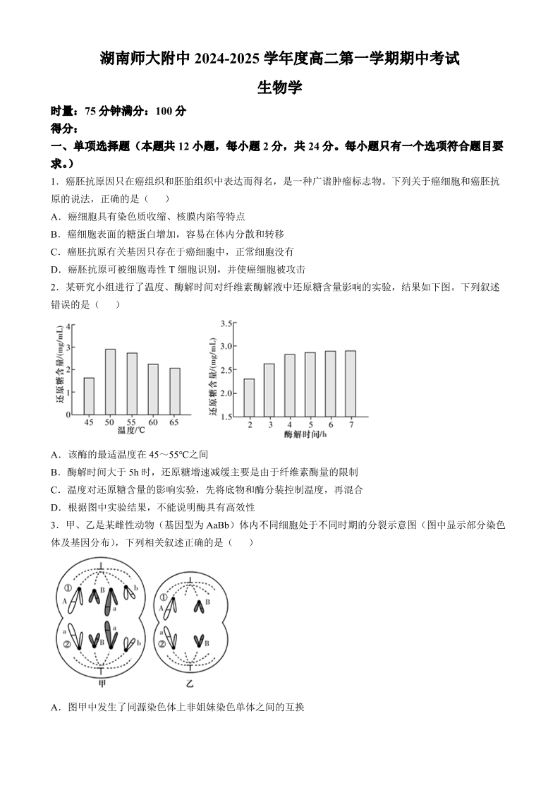 湖南师大附中2024-2025学年度高二第一学期期中考试 生物