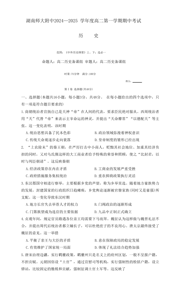 湖南师大附中2024-2025学年度高二第一学期期中考试 历史