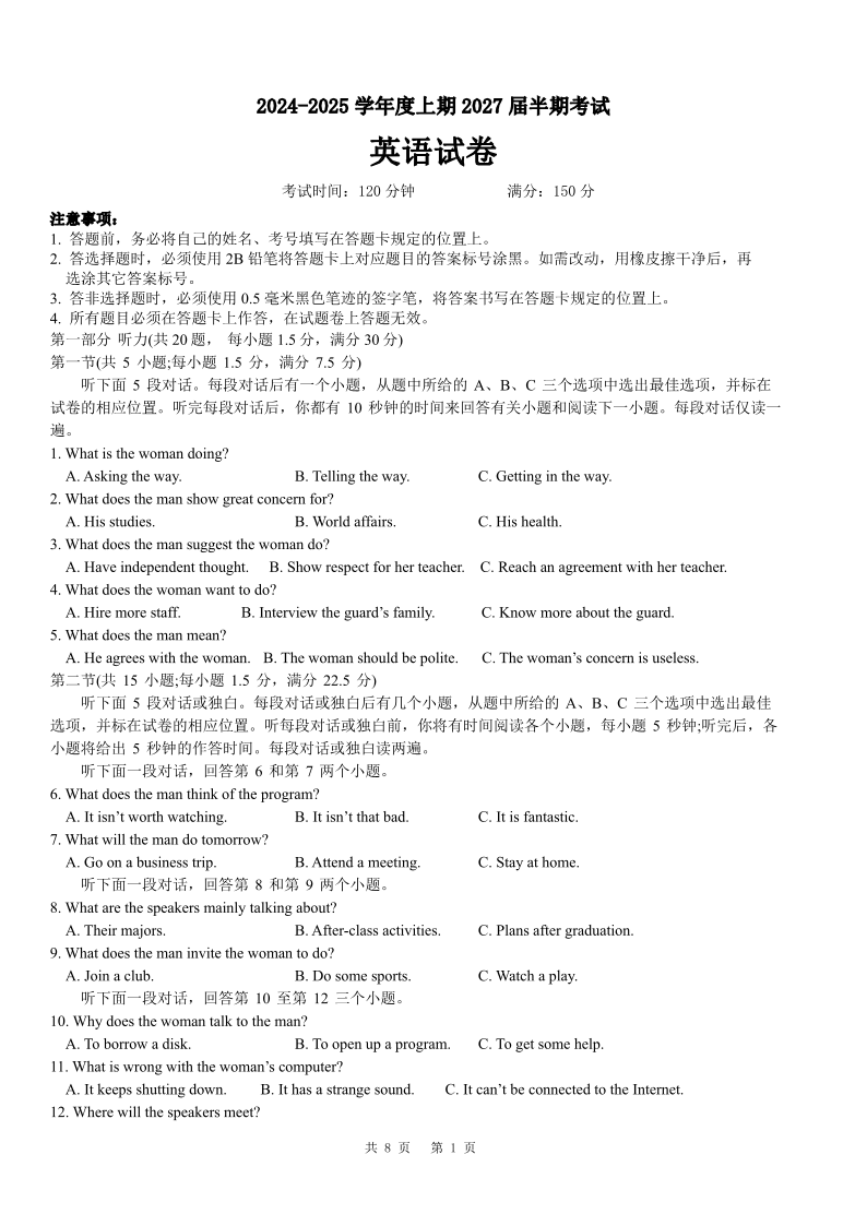 四川省成都市第七中学2024-2025学年高一上学期11月期中考试 英语