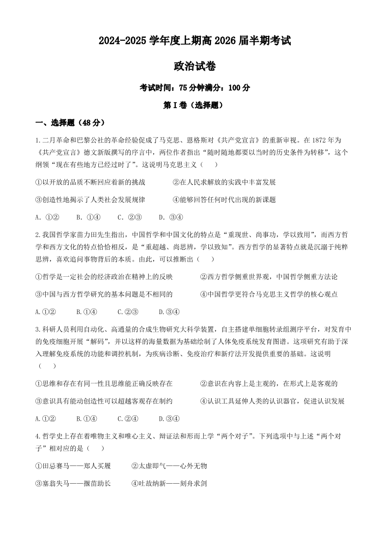 四川省成都市第七中学2024-2025学年高二上学期11月期中考试 政治