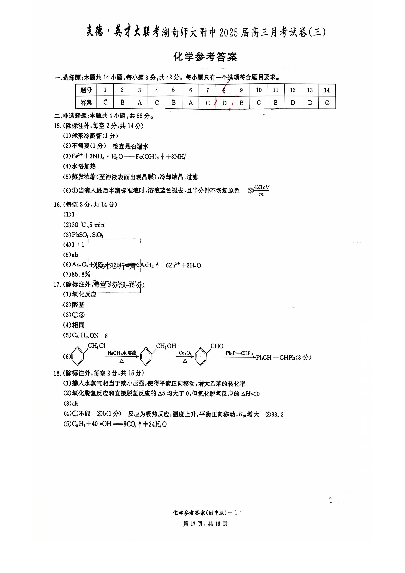 湖南师范大学附属中学2025届高三月考卷(三)化学答案