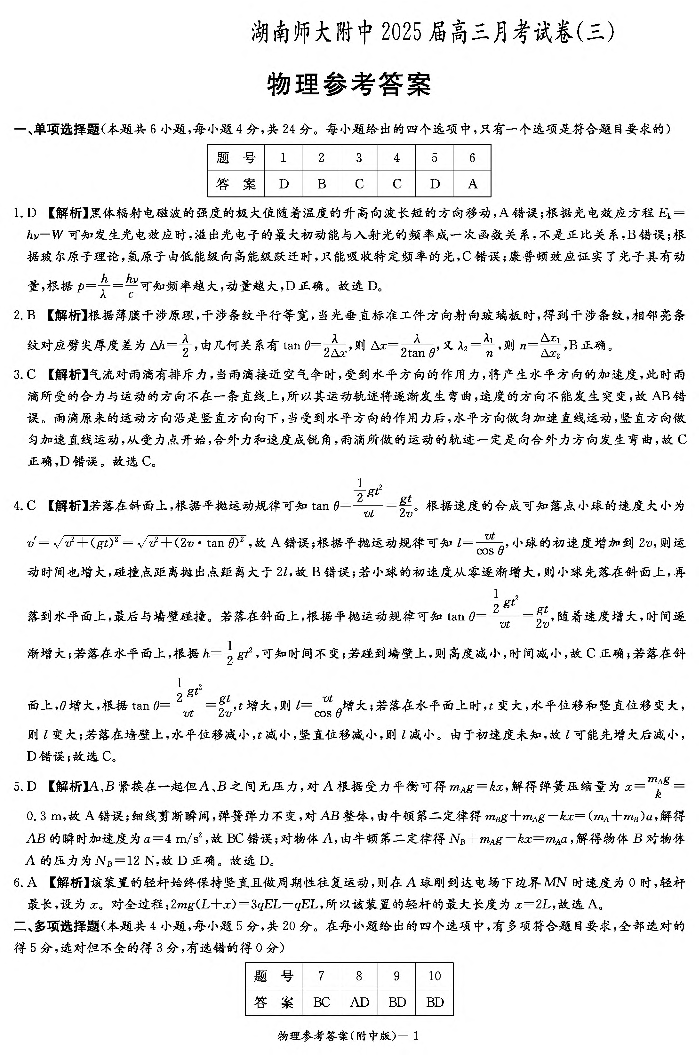 湖南师范大学附属中学2025届高三月考卷(三)物理答案