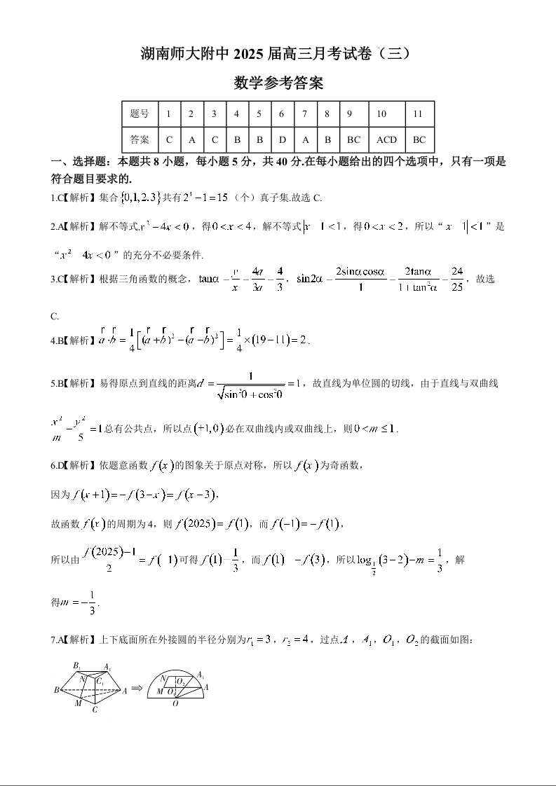 湖南师范大学附属中学2025届高三月考卷(三)数学答案