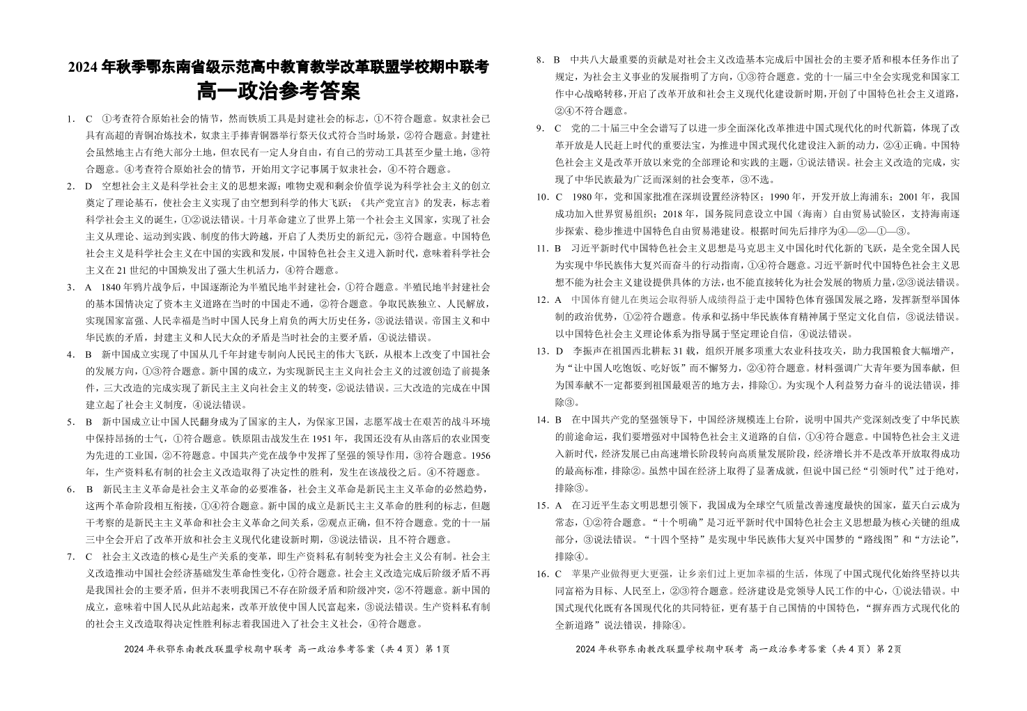 2024年秋季鄂东南联盟学校高一年级期中联考 政治参考答案