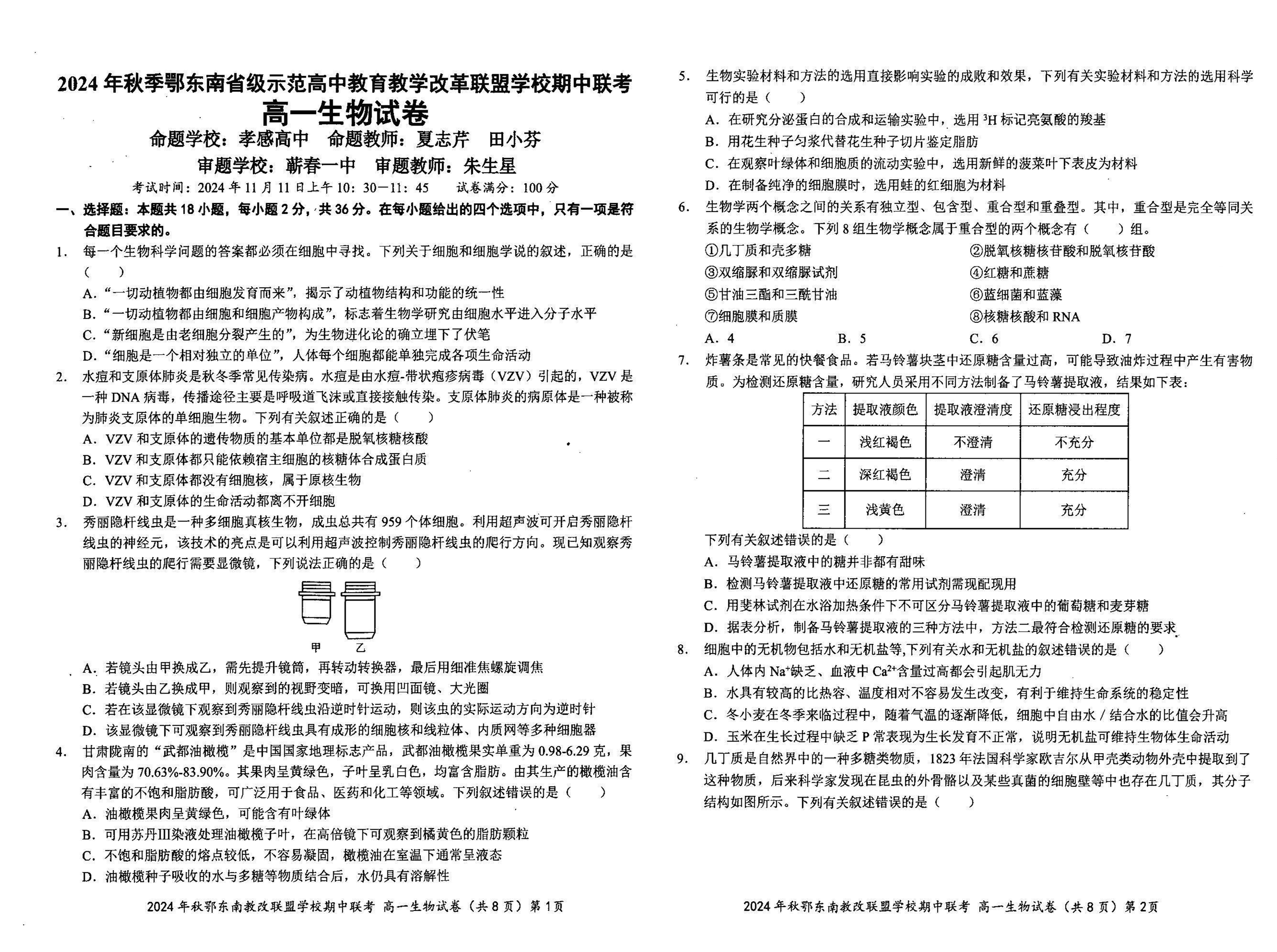 2024年秋季鄂东南联盟学校高一年级期中联考 生物