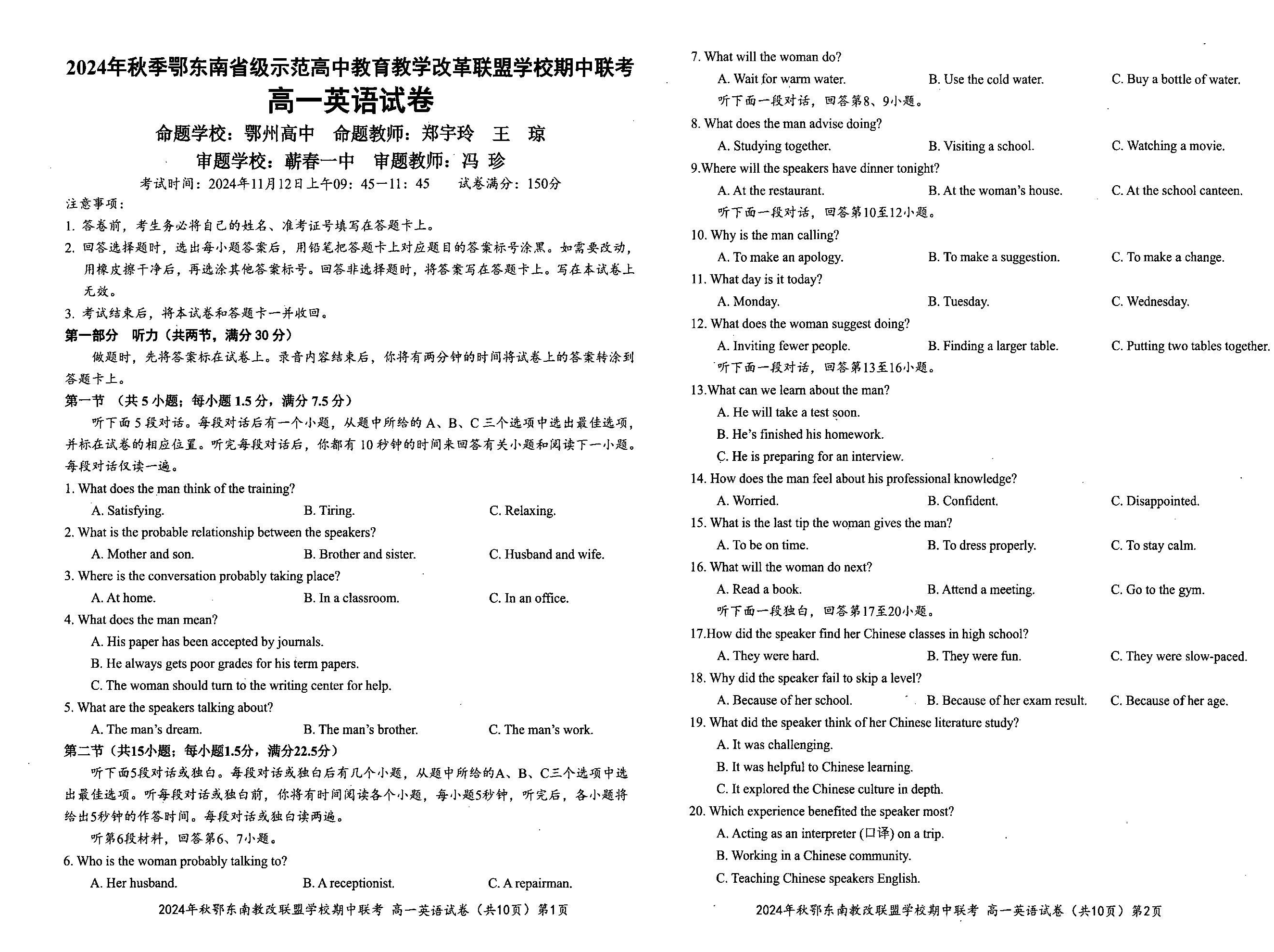 2024年秋季鄂东南联盟学校高一年级期中联考 英语