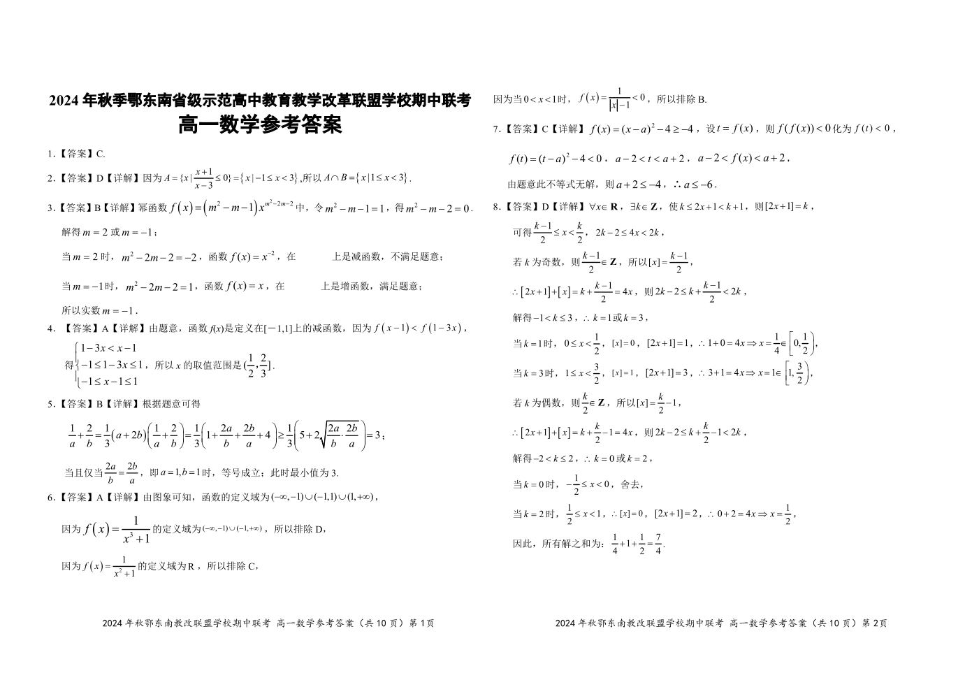 2024年秋季鄂东南联盟学校高一年级期中联考 数学参考答案