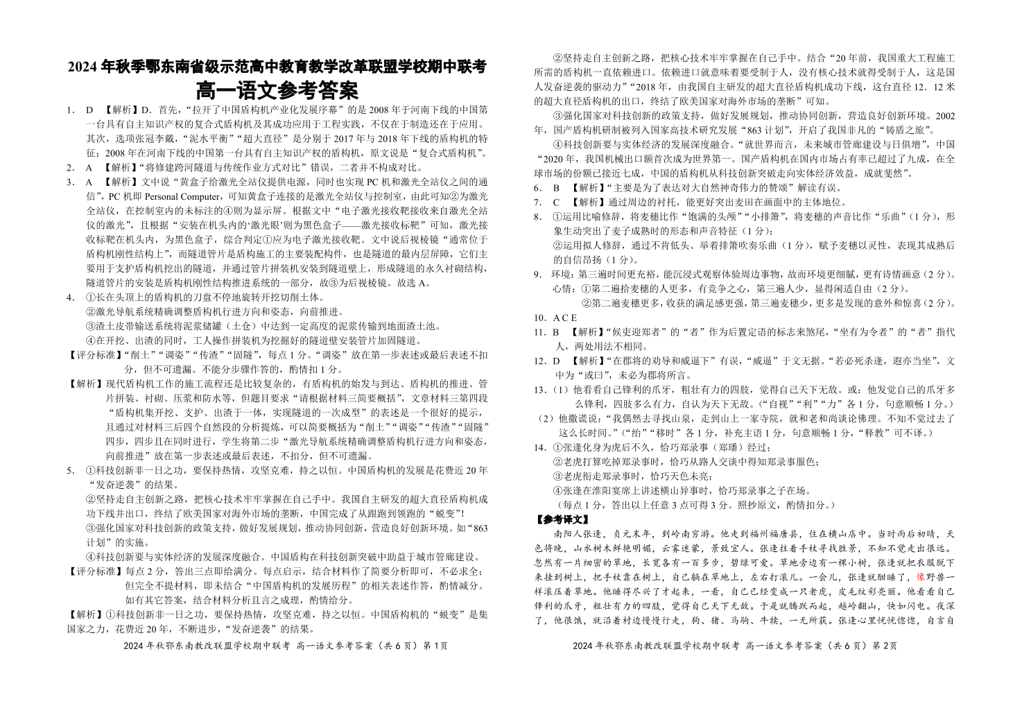 2024年秋季鄂东南联盟学校高一年级期中联考 语文参考答案