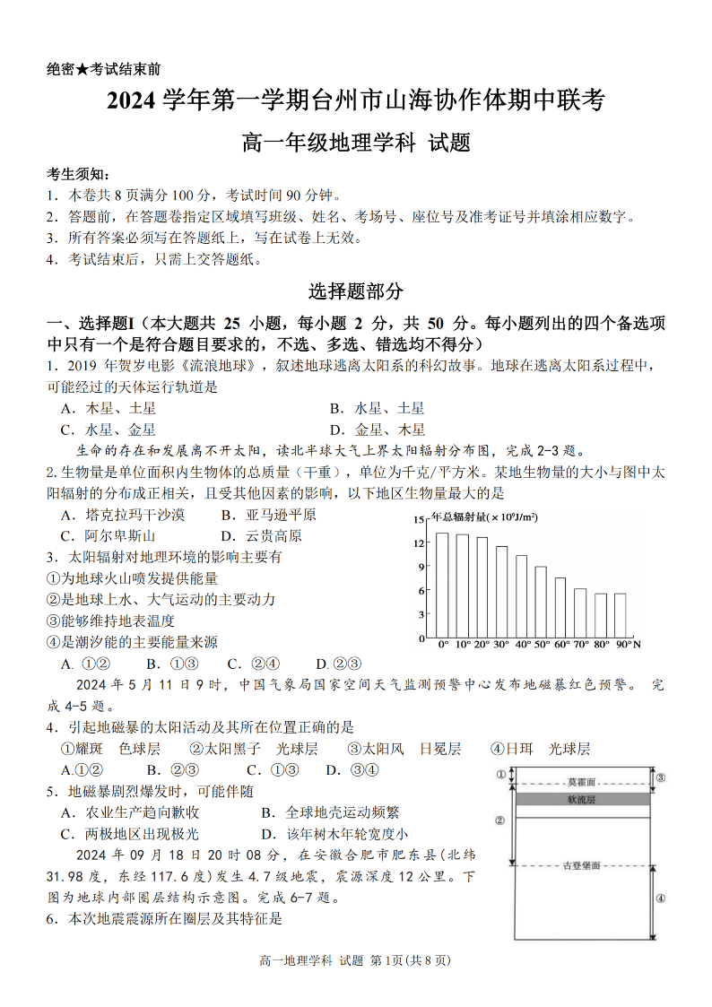 台州市山海协作体2024学年高一第一学期期中联考 地理