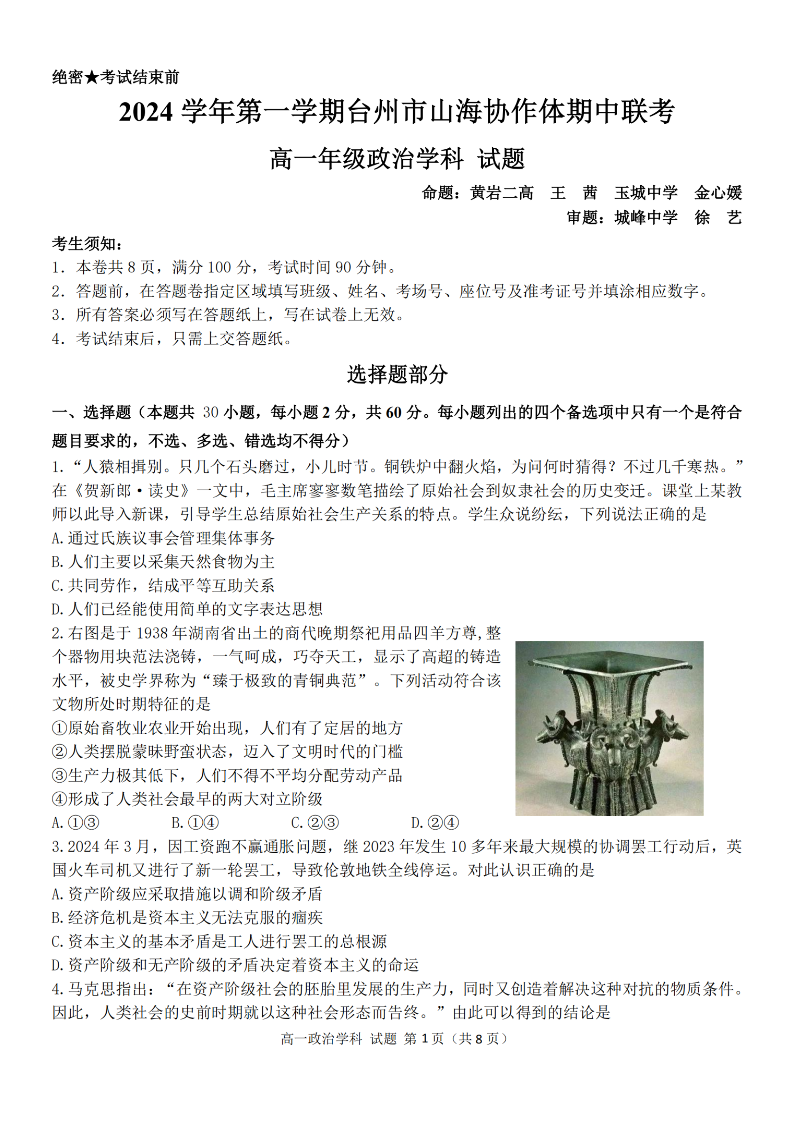 台州市山海协作体2024学年高一第一学期期中联考 政治