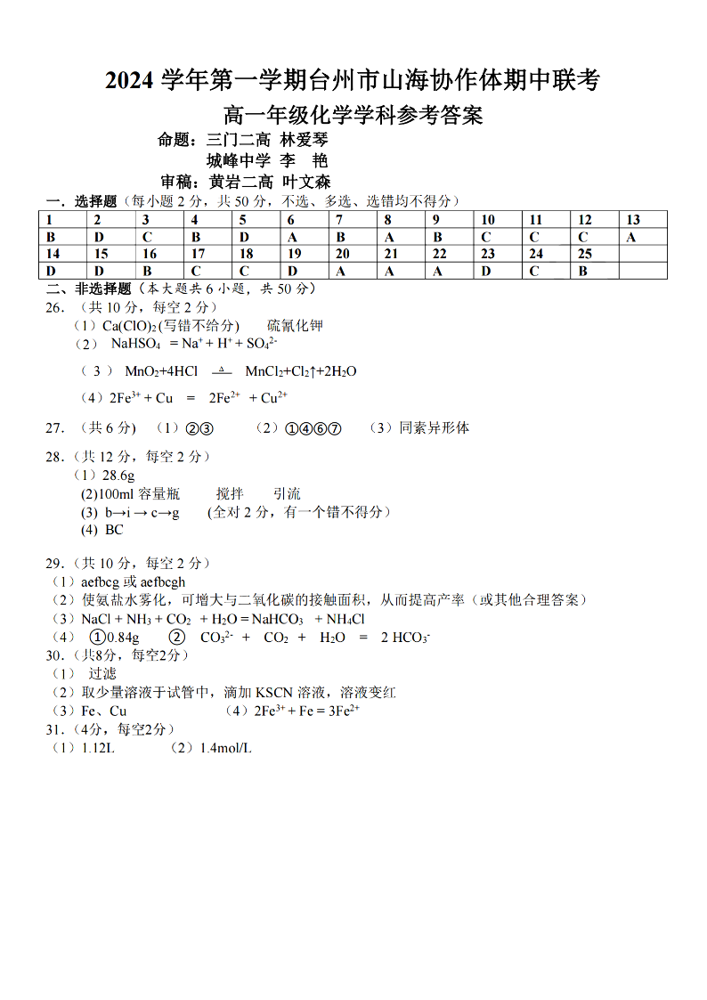 台州市山海协作体2024学年高一第一学期期中联考 化学答案