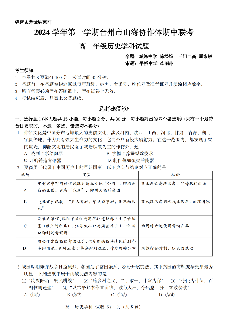 台州市山海协作体2024学年高一第一学期期中联考 历史
