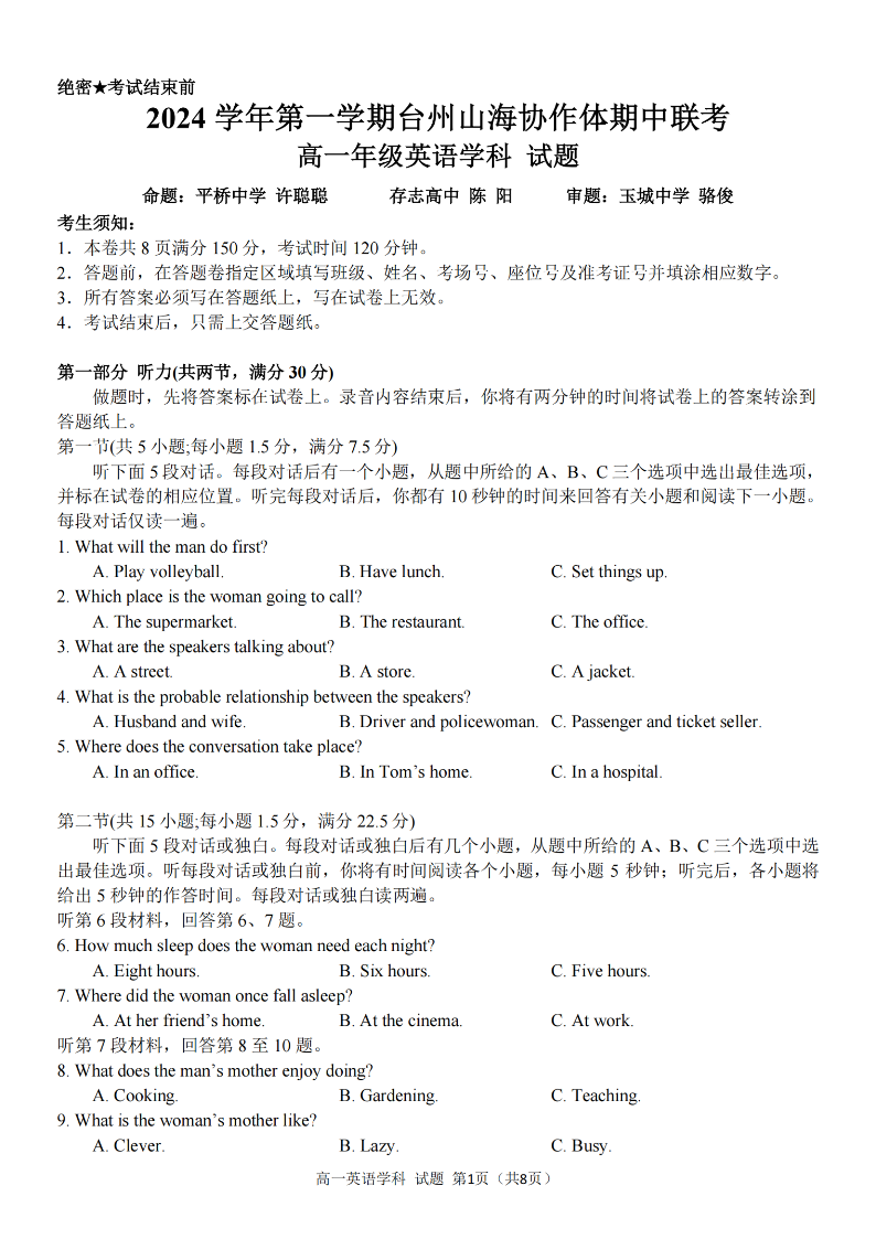 台州市山海协作体2024学年高一第一学期期中联考 英语