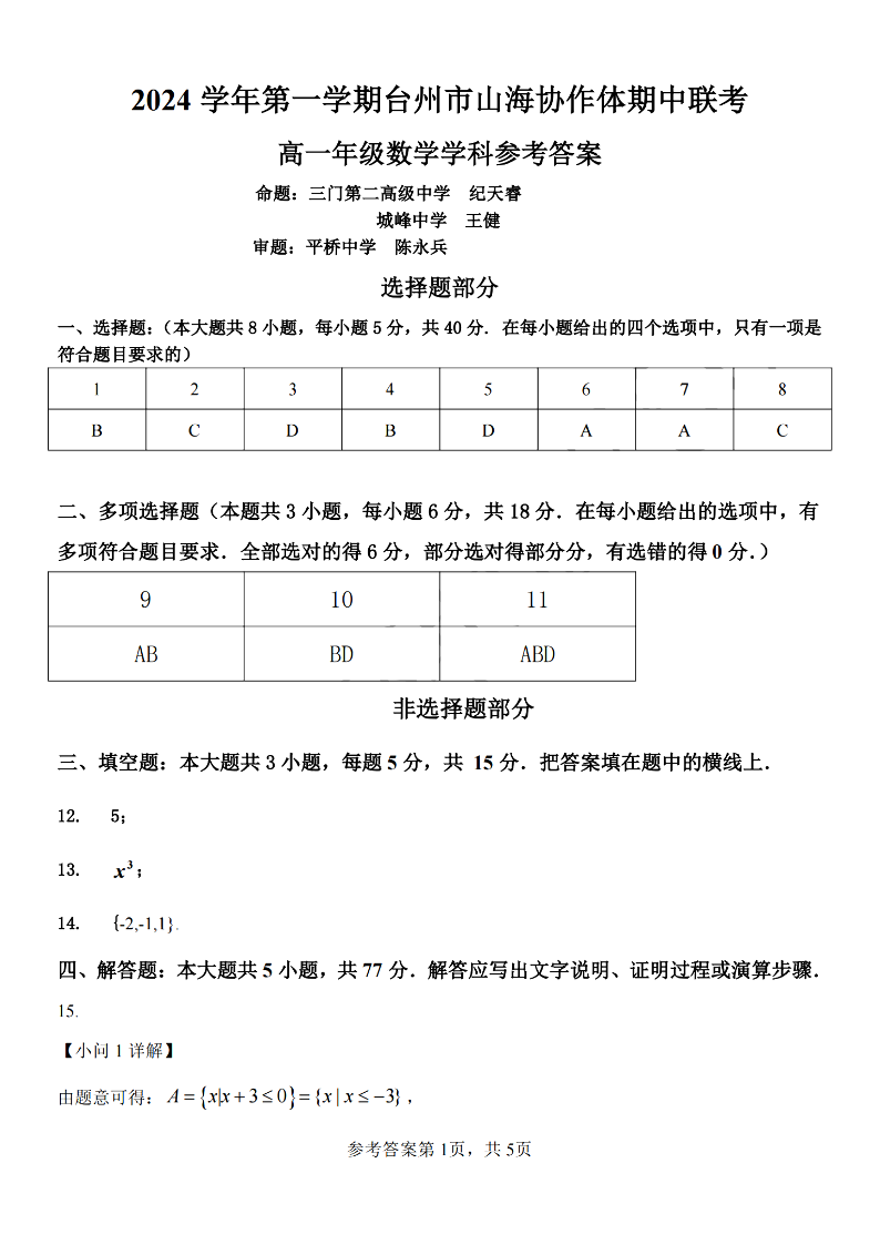 台州市山海协作体2024学年高一第一学期期中联考 数学答案