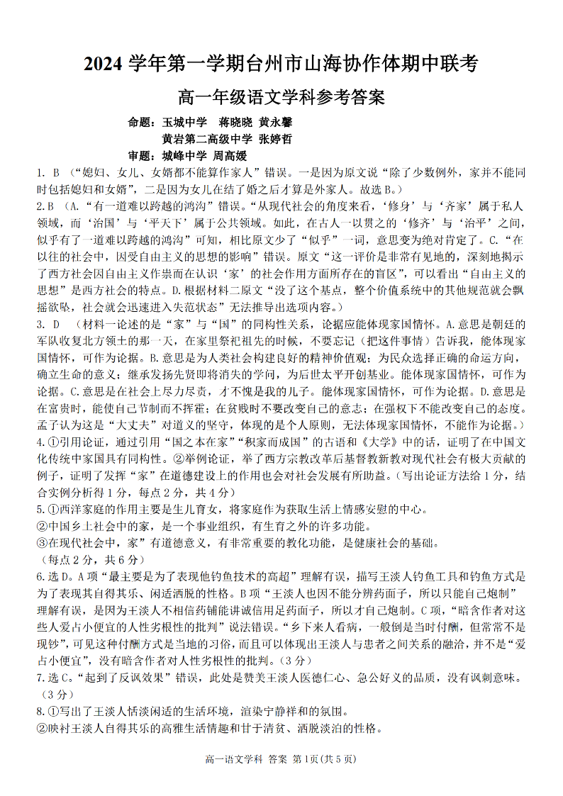 台州市山海协作体2024学年高一第一学期期中联考 语文答案