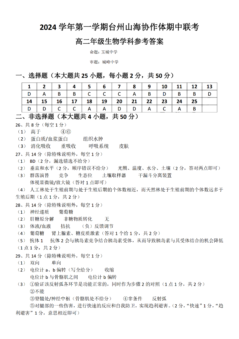 台州市山海协作体2024学年高二第一学期期中联考 生物答案