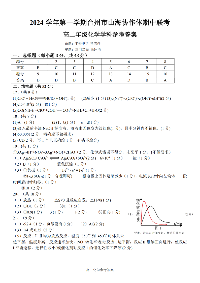 台州市山海协作体2024学年高二第一学期期中联考 化学答案