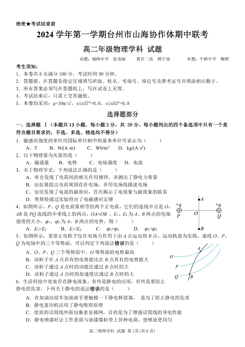 台州市山海协作体2024学年高二第一学期期中联考 物理