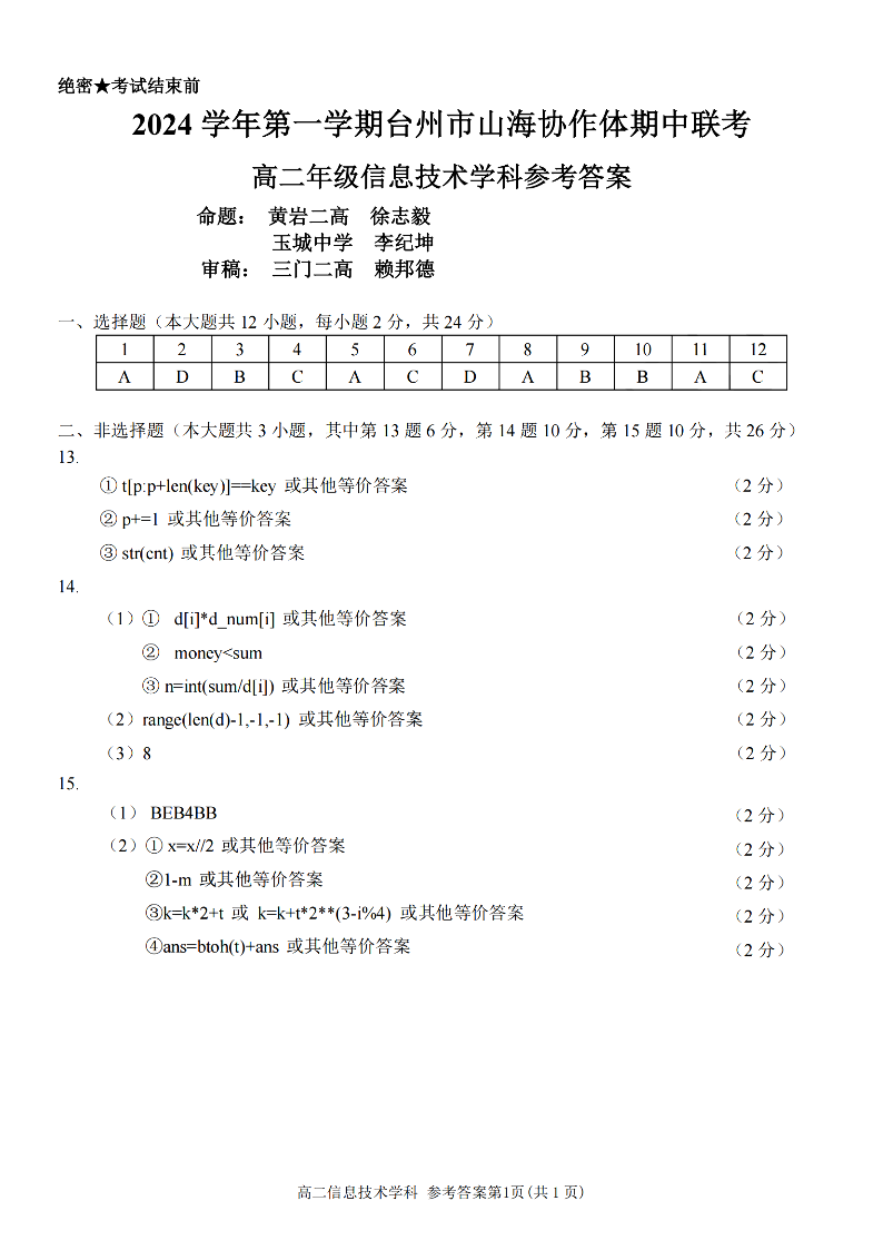 台州市山海协作体2024学年高二第一学期期中联考 技术答案