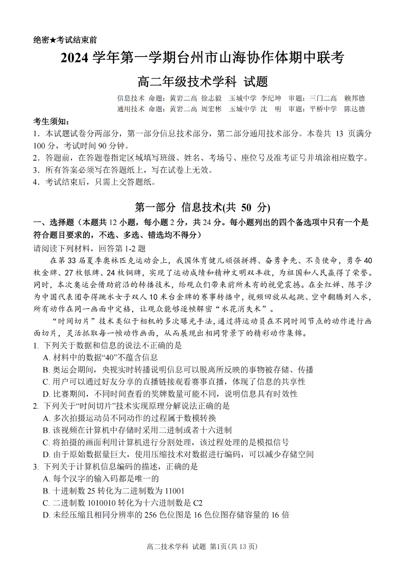 台州市山海协作体2024学年高二第一学期期中联考 技术
