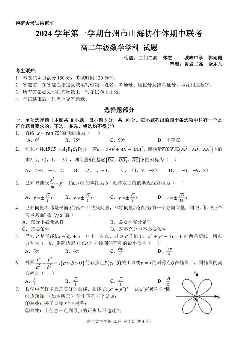 台州市山海协作体2024学年高二第一学期期中联考 数学