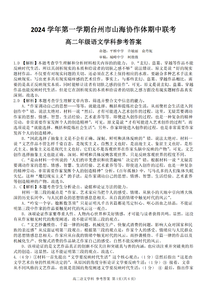 台州市山海协作体2024学年高二第一学期期中联考 语文答案