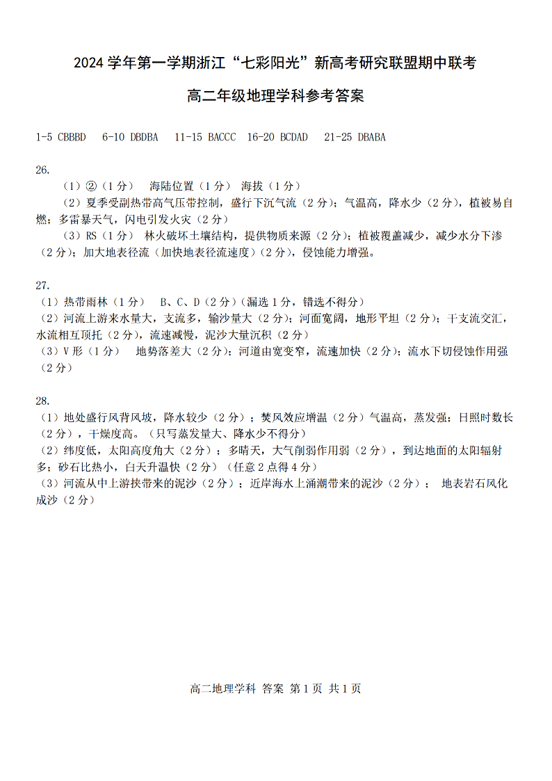 七彩阳光联盟2024学年高二第一学期新高考期中联考 地理答案
