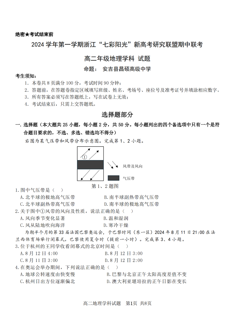 七彩阳光联盟2024学年高二第一学期新高考期中联考 地理