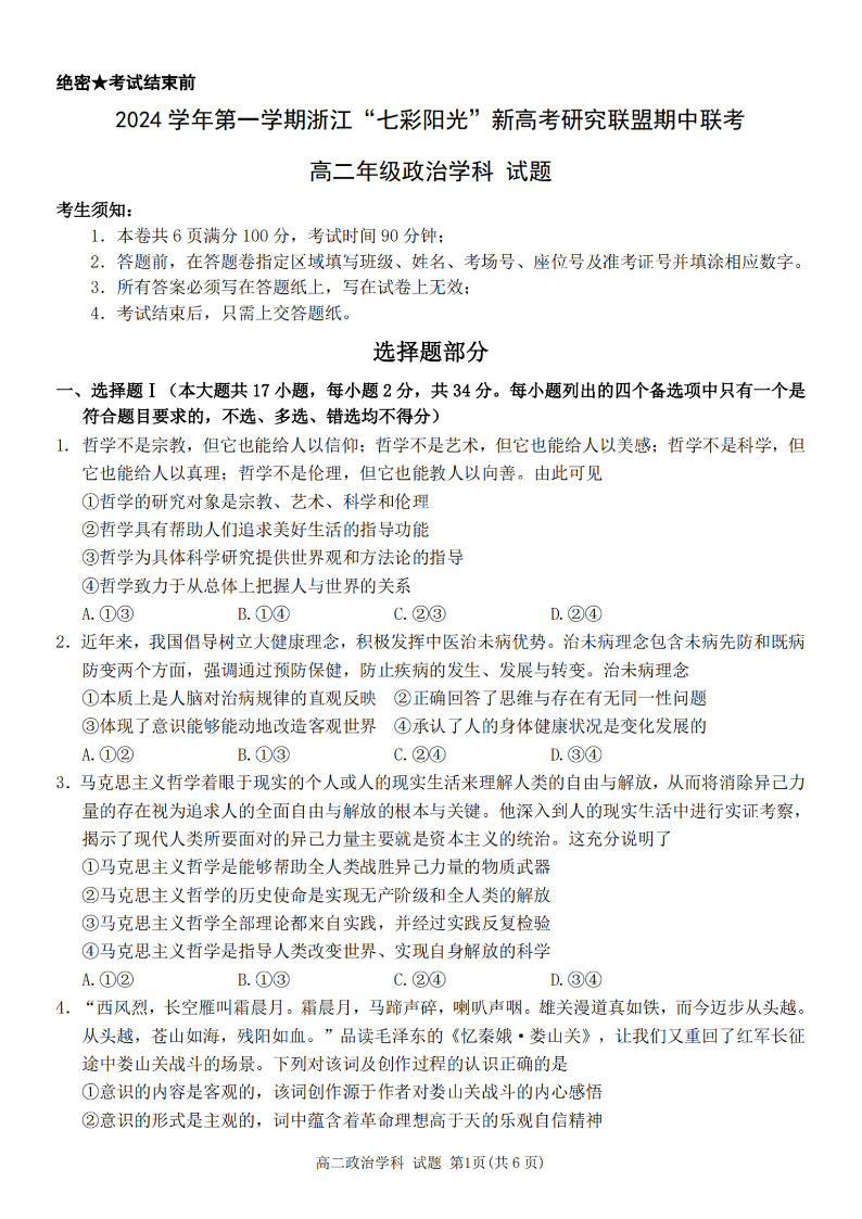 七彩阳光联盟2024学年高二第一学期新高考期中联考 政治