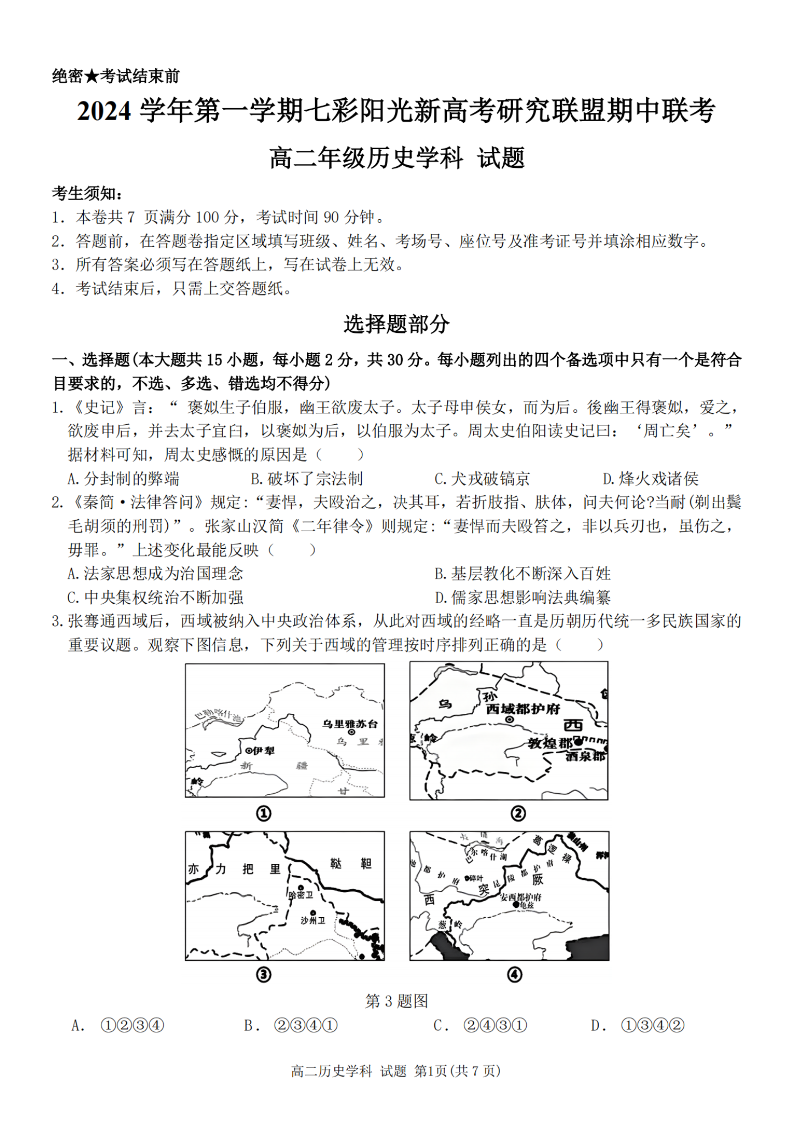 七彩阳光联盟2024学年高二第一学期新高考期中联考 历史