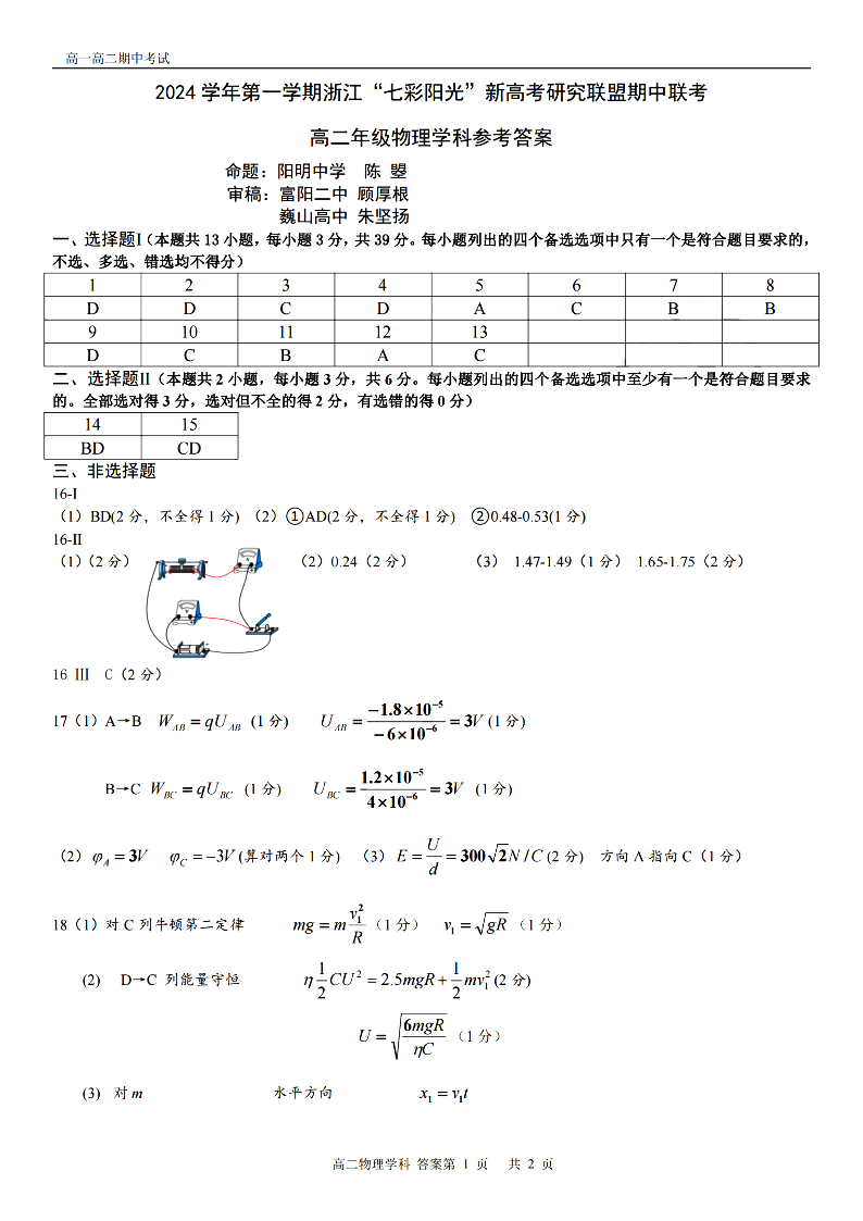 七彩阳光联盟2024学年高二第一学期新高考期中联考 物理答案