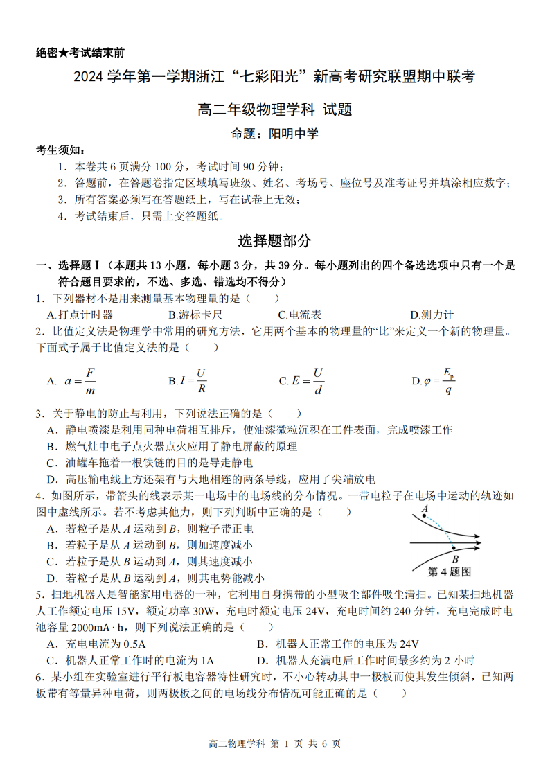 七彩阳光联盟2024学年高二第一学期新高考期中联考 物理