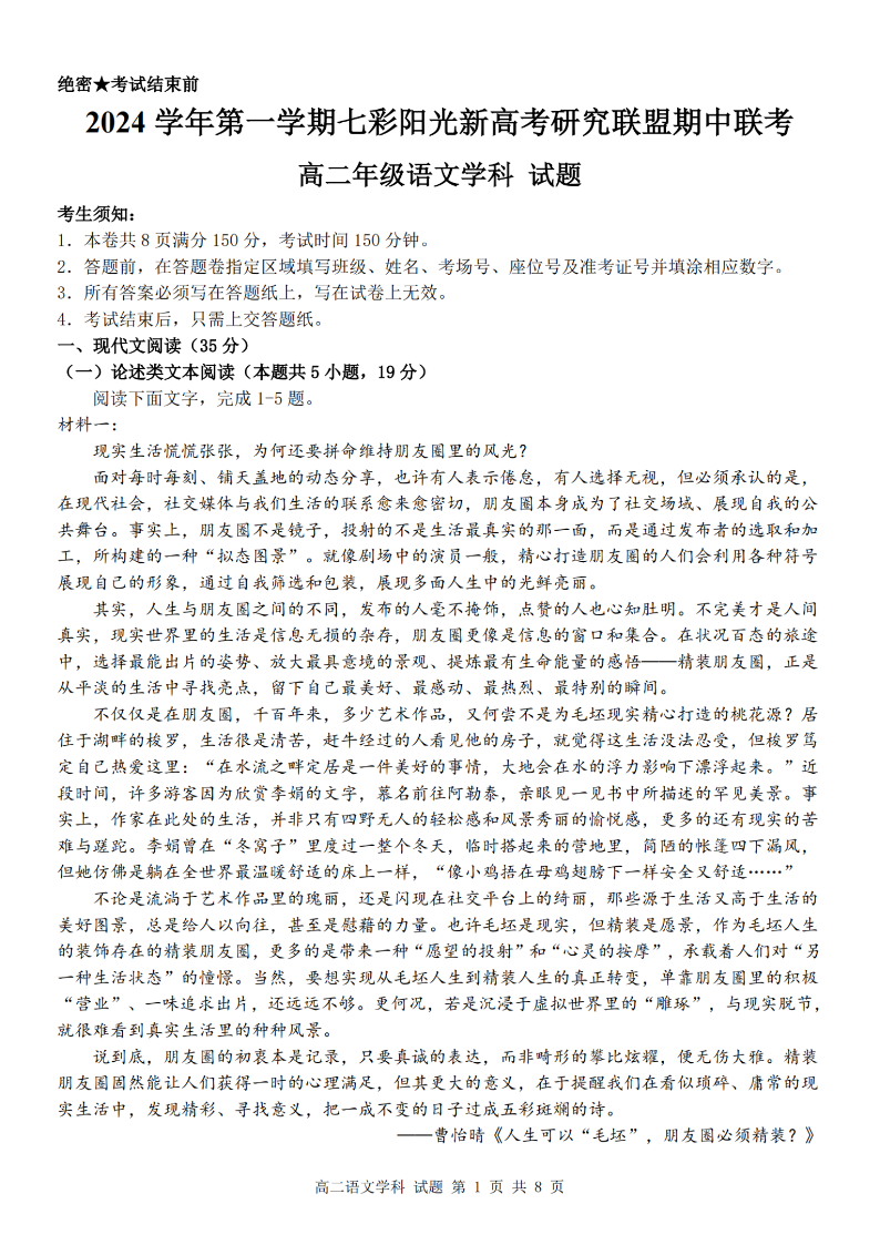 七彩阳光联盟2024学年高二第一学期新高考期中联考 语文