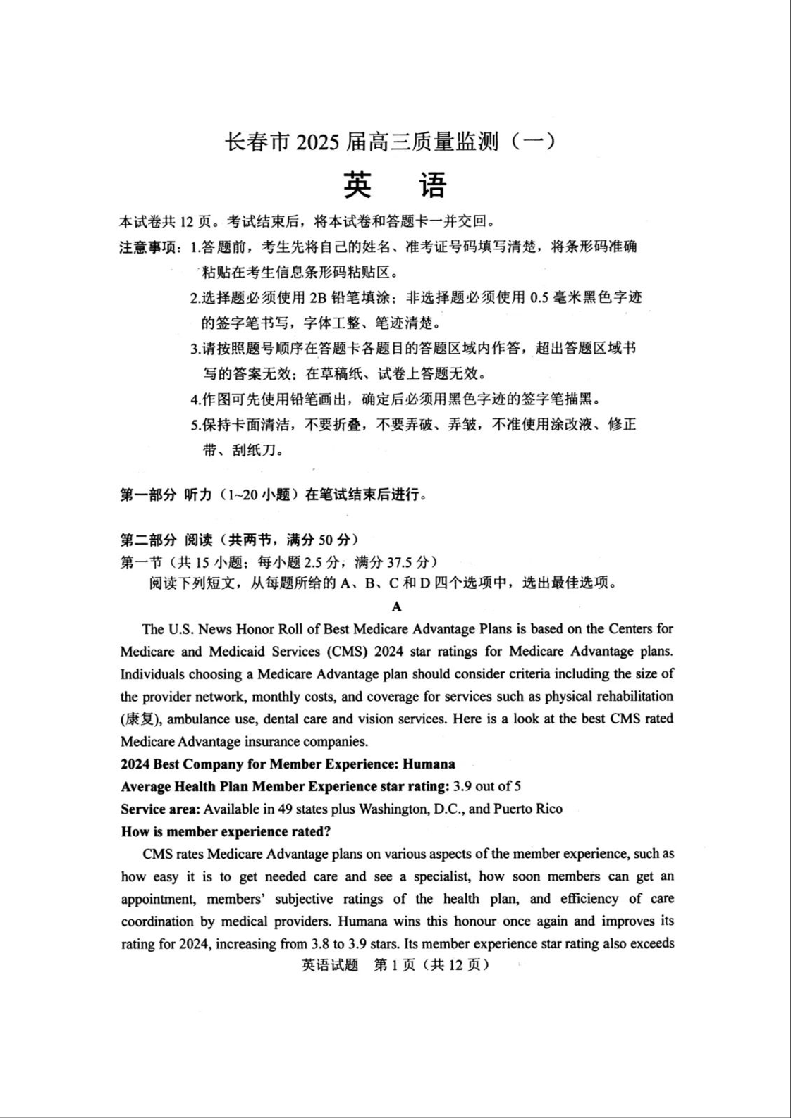 吉林省长春市2025届高三质量监测(一)英语