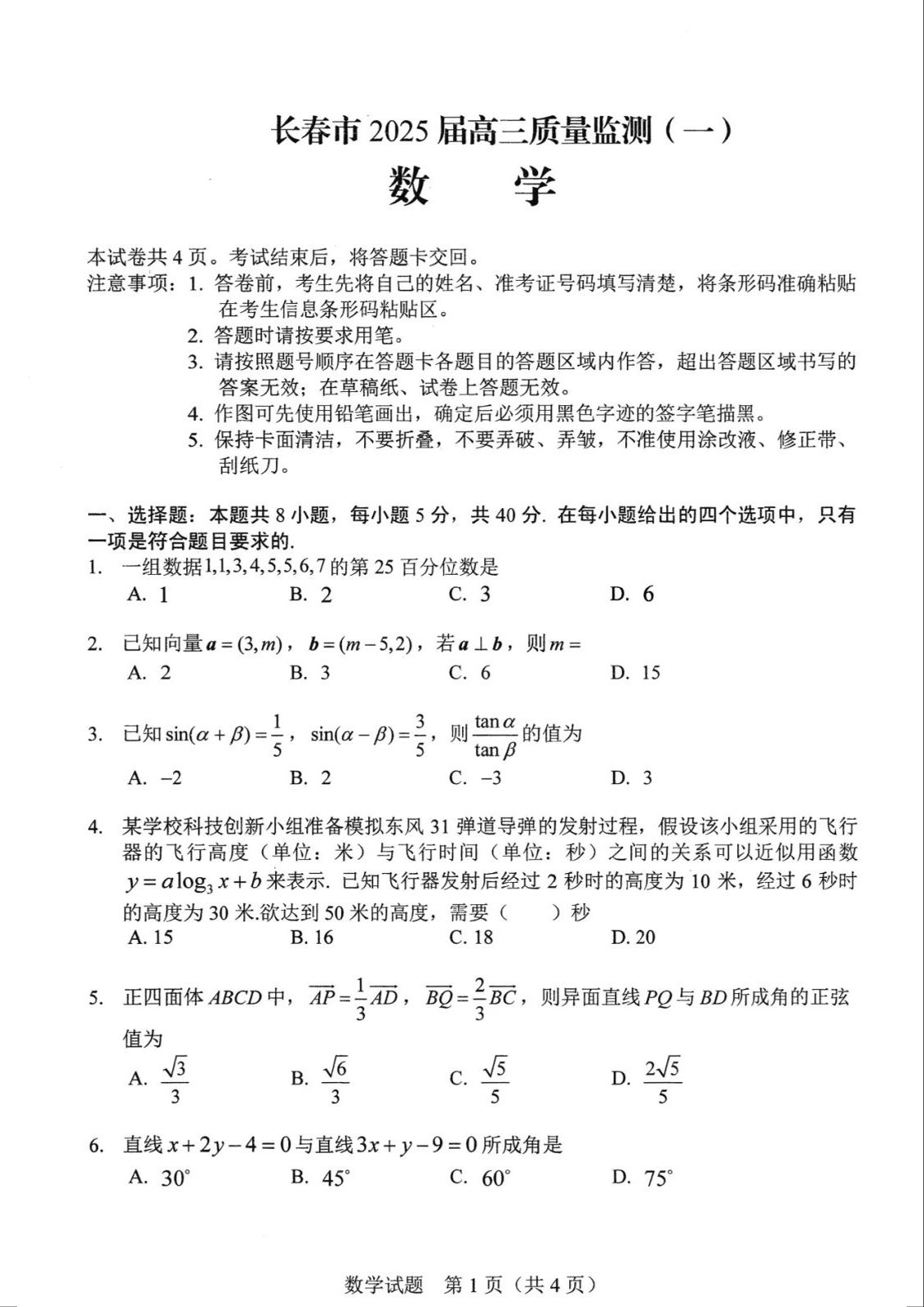 吉林省长春市2025届高三质量监测(一)数学