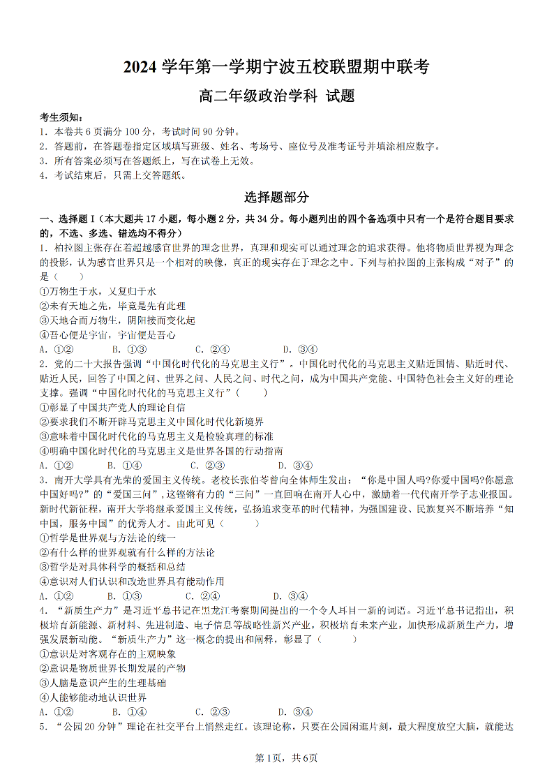 政治卷-宁波五校高二期中