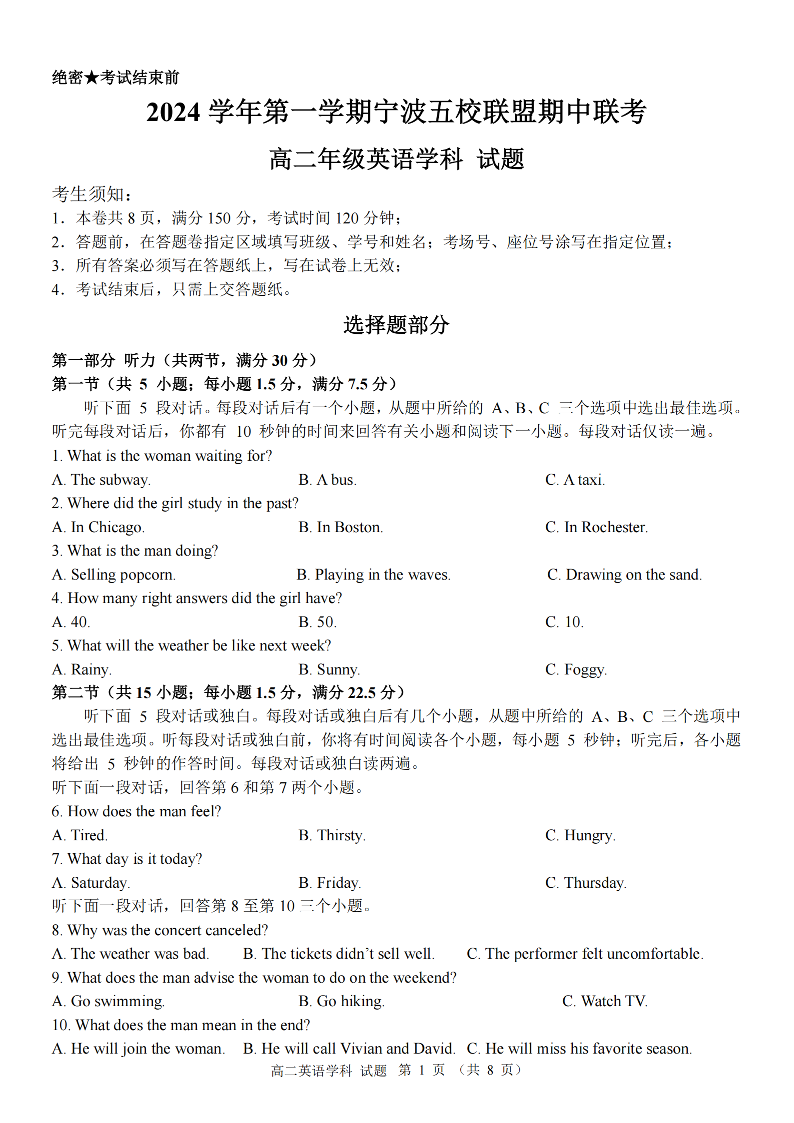 英语卷-宁波五校高二期中