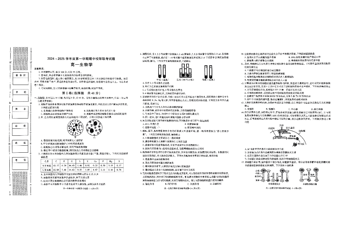 陕西省汉中市2024-2025学年高一上学期11月期中联考 生物