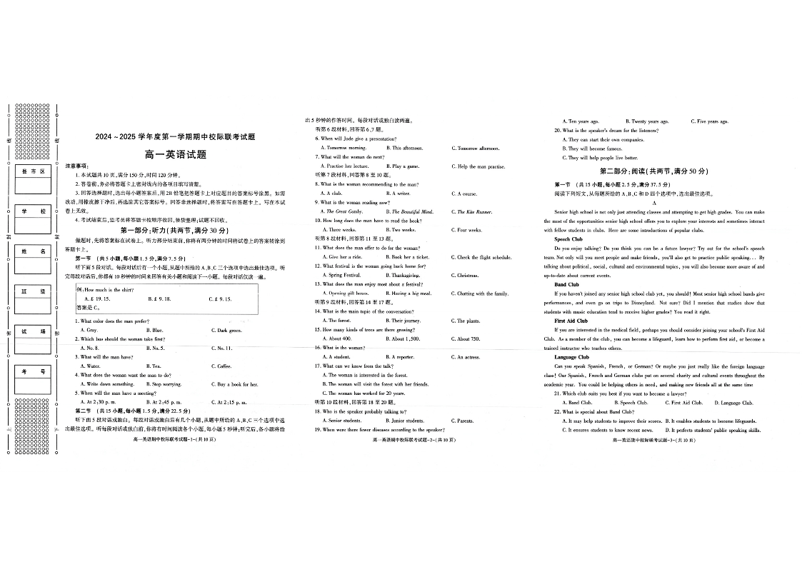 陕西省汉中市2024-2025学年高一上学期11月期中联考 英语