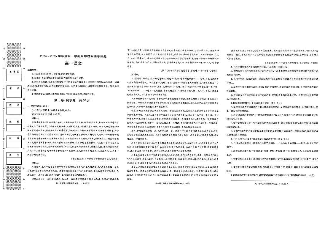 陕西省汉中市2024-2025学年高一上学期11月期中联考 语文